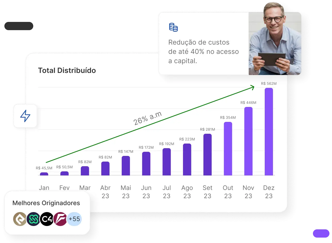 Somos uma Plataforma de acesso ao mercado de capitais. Estruturamos e distribuímos operações com recebíveis em poucos dias, reduzindo custos em até 40% e conectando você com os melhores investidores do mercado.